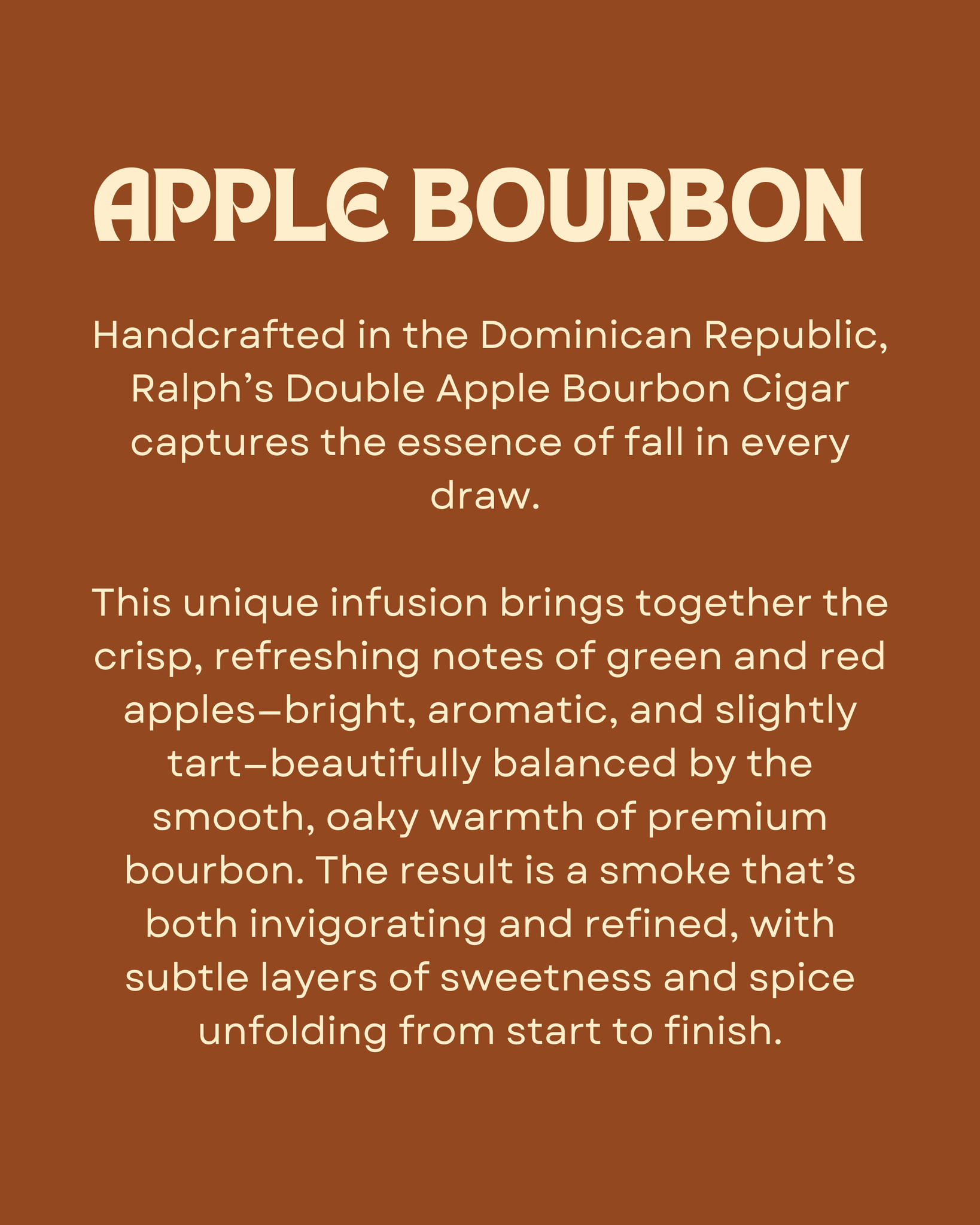 This limited edition Double Apple Flavored Bourbon Infused Cigar captures the essence of fall in every draw. A rich blend of juicy red and smooth green apple pairs beautifully with deep bourbon warmth and maduro sweetness—sweet, balanced, and full of depth.